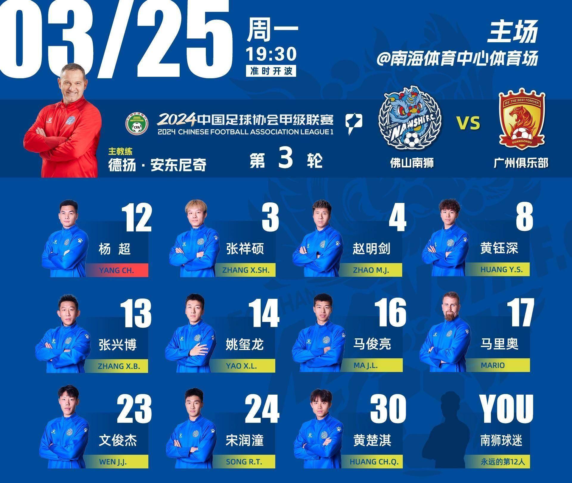 本场竞赛,佛山南狮主帅安东尼尼组织了单外援马里奥领衔首发,赵明剑担任队长,杨超担任门将。张祥硕、黄玉深、张兴波、姚锡龙、马俊良、文豪杰、宋润通、黄楚奇也出现在场上。