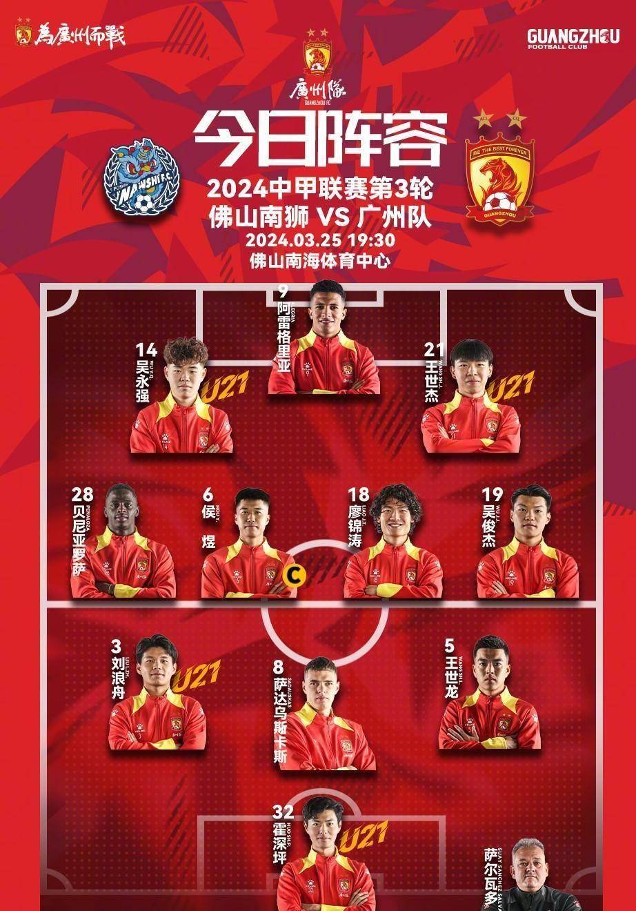 广州主帅萨尔瓦多组织了三名外援领衔首发,分别是:阿莱格里亚、贝纳罗萨、萨尔达·乌斯卡斯;侯宇担任队长,霍神平担任门将,刘浪洲、王世龙、吴豪杰、廖金涛、王世杰、吴永强一起首发。
