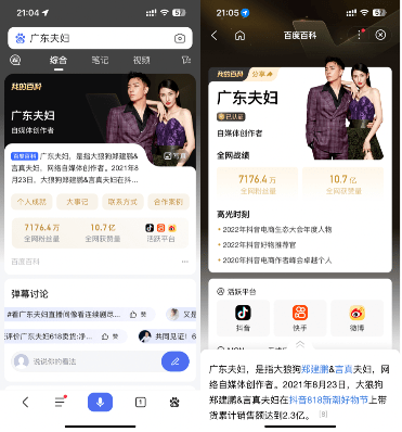 随同这届“最卷”618的收官,各大渠道主播的战绩再次成为了营销职业重视的焦点,其间靠拍“收租”视频涨粉5000万的“广东配偶”,凭仗改写渠道买卖记载的13亿GMV跻身这个618的最强主播队伍。除了耀眼的带货成果,相同引发业界重视的还有“广东配偶”在618期间上线个人百科的这一行为——据悉,广东配偶在“战火纷飞”的618期间,还特别在百度入驻了“我的百科”,将自己的联系方式、全网战绩、所属组织、协作事例等相关联的内容,经过专属的定制卡片在词条”广东配偶“的百度查找出来的成果中置顶显现。
