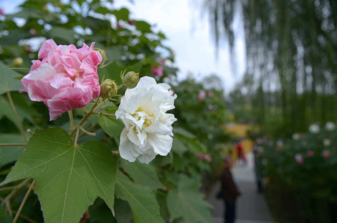 芙蓉花又名木芙蓉,原产我国,叶大丛生,秋天开花,花形大气,在四川、云南、湖南、广西、广东等地均有散布,而以成都一带培养最多,前史最为悠长。蜀后主孟昶主政时期,在城墙上遍种芙蓉,成都故得名“芙蓉城”“蓉城”。1983年,芙蓉花成为成都市市花,尔后每年芙蓉花展践约而至,观者如潮。